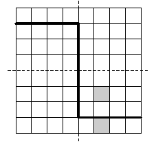Рассмотрим случай, когда Вася закрасил две клетки в одной четвертинке n×n. Эти клетки лежат либо в разных столбцах, либо в разных строках (иначе бы эти клетки совпали). Пусть для определённости закрашенные клетки лежат в разных строках (для столбцов рассуждение аналогично). Разрежем четвертинку n×n по горизонтали так, чтобы закрашенные клетки оказались в разных её частях. После этого продолжим разрез по границе четвертинок до центра квадрата 2n×2n и отразим получившийся разрез относительно этого центра (см. рисунок).
