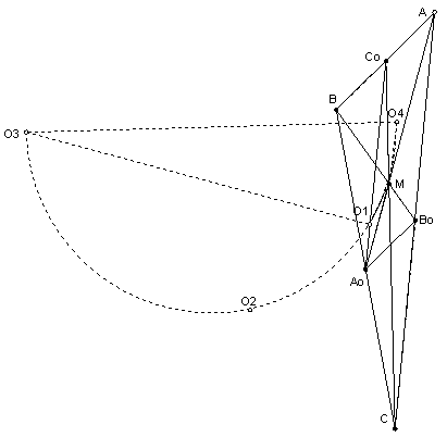 Угол MO1O3 равен половине центрального угла MO1A0 окружности ω1, то есть вписанному в неё углу MB0A0. Если O4 совпадает с O3, то всё доказано, иначе прямая O4O3 – серединный перпендикуляр к отрезку MС0, поэтому угол MO4O3 равен половине центрального угла MO4C0 окружности ω4, то есть вписанному в неё углу MBC0. А углы MB0A0 и MBС0 равны из параллельности B0A0 и BС0. Поэтому ∠MO1O3 = ∠MO4O3, то есть O4 лежит на ω. Аналогично O2 лежит на ω.