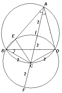 Без ограничения общности можно считать, что AB ≥ AD. Проведём окружность с центром С и радиусом 2, которая пересечёт сторону АВ в точке Е (рис. справа). Биссектриса АС угла ВАD является её осью симметрии и осью симметрии угла, значит, точки E и D симметричны относительно АС. Следовательно, АЕ = AD.
