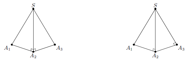1) Соседние углы в двух соседних боковых гранях – прямые. Пусть, например, ∠SA2A1 = ∠SA2A3 = 90° (рис. слева). Тогда по признаку перпендикулярности прямой и плоскости SA2 ⊥ A1A2A3, то есть SA2 – высота пирамиды, и она принадлежит боковой поверхности пирамиды.