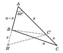 Предположим противное. Пусть в треугольнике ABC угол A равен 60°, BC = a, AB = a – x, тогда AC = a + x. Выберем на луче AB точку B', а на луче AC точку C' так, что AB' = AC' = a.