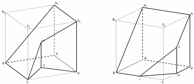 Из большого количества возможных примеров приведём два, взяв за основу чертежа прямоугольный параллелепипед АВСDA1B1C1D1 (см. рисунки).