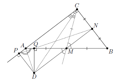 Пусть D – центр вневписанной окружности треугольника ACM, тогда P и Q – проекции точки D на прямые AC и AB соответственно (см. рис.). Так как MN – медиана равнобедренного треугольника BMC, проведённая к основанию, то MN – биссектриса угла BMC, поэтому точка D лежит на прямой MN. Кроме того, MN – средняя линия треугольника ABC, значит, MN || AC. Таким образом, PCND – прямоугольник.