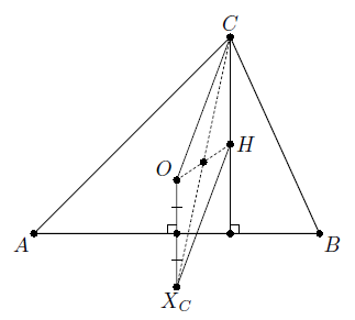 Так как центры вневписанных окружностей равноудалены от прямых, содержащих стороны треугольника, то прямая IAXC симметрична прямой, проходящей через IA и перпендикулярной BC, относительно прямой IAIB. Аналогично рассматривается симметрия прямой IBXC относительно прямой IAIB. Следовательно, точка XC симметрична точке пересечения перпендикуляров к сторонам BC и AC треугольника, проведённых из точек IA и IB соответственно, относительно прямой IAIB. Аналогично можно определить точки XA и XB.