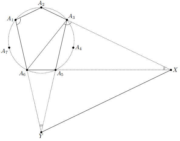 Докажем, что ∠A2A1Y + ∠XYA1 = 180°, откуда и будет следовать утверждение задачи. Рассмотрим описанную окружность данного семиугольника (см. рис.). Поскольку четырёхугольник A1A2A3A6 – вписанный, то ∠A2A1A6 = ∠XA3A6. Теперь достаточно доказать, что четырёхугольник XA3A6Y вписанный.