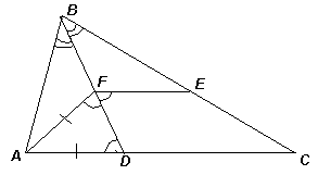 Так как AF = AD, то ∠АFD = ∠ АDF, а из параллельности EF и AC следует, что ∠АDF = ∠ЕFD (см. рис.). Следовательно, ∠АFD = ∠ЕFD, тогда равны и углы, смежные с ними: ∠АFB = ∠ЕFB. Учитывая, что ∠ АВF = ∠ЕВF, получим, что треугольники АВF и ЕВF равны по стороне и двум углам. Значит, AВ = ВЕ.