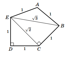 Докажем, что существует удовлетворяющий условию пятиугольник, у которого ∠D = 90°. Сначала построим прямоугольный треугольник CDE, с катетами CD и DE, равными 1. Тогда