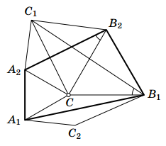 Внутри выпуклого четырехугольника A1A2B2B1 нашлась такая точка C, что треугольники CA1A2 и CB2B1 – правильные. Точки C1 и C2 симметричны точке C относительно прямых A2B2 и A1B1 соответственно. Докажите, что треугольники A1B1C1 и A2B2C2 подобны.