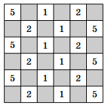Решение 2: В двух соседних вертикалях ставим число x0 = 1, в соседних с ними x1 = 2, затем x2 = 5 и т.д. по правилу xn = F2n+ 1, где F2n+1 – это (2n+1)-е число Фибоначчи. Часть этой расстановки в квадрате 6×6 показана на рисунке.