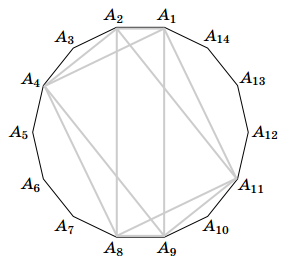 а) Пусть A1A2...A14 – правильный 14-угольник (см. рис.). Отметим шесть его вершин: A1, A2, A4, A8, A9, A11. Ясно, что если некоторые два отрезка с концами в вершинах этого многоугольника параллельны, то между ними с двух сторон лежит равное число сторон 14-угольника. Из отрезков с концами в отмеченных шести вершинах этим свойством обладают только пары отрезков A1A2 и A8A9, A2A4 и A9A11, A1A4 и A8A11, A4A8 и A1A11, A4A9 и A2A11, A1A9 и A2A8. Перечисленные пары отрезков являются сторонами трёх параллелограммов, вписанных в окружность, то есть прямоугольников.