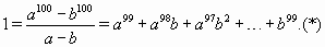 Если a и b отрицательны, то правая часть в () также отрицательна, что невозможно. Если же a и b положительны, то все слагаемые в правой части () положительны, поэтому она больше чем a99 + b99; итак, a99 + b99 < 1. С другой стороны, поскольку 0 < |a|, |b| < 1, то a99 + b99 > a100 + b100 = 1. Противоречие.