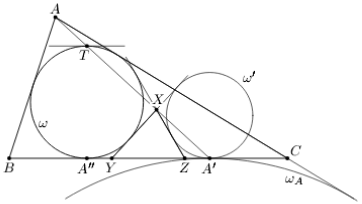 Окружность ω вписана в треугольник ABC, в котором AB < AC. Вневписанная окружность этого треугольника касается стороны BC в точке A'. Точка X выбирается на отрезке A'A так, что отрезок A'X не пересекает ω. Касательные, проведённые из X к ω, пересекают отрезок BC в точках Y и Z. Докажите, что сумма XY + XZ не зависит от выбора точки X.