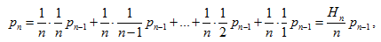 где Hn = 1 + ½ + ... + 1/n – n-е гармоническое число. Учитывая, что p1 = 1 (если джентльмен только один, то он обязательно возьмёт свою шляпу), получаем