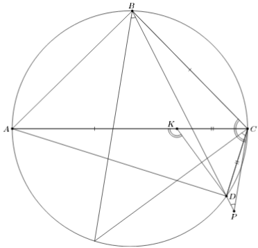 Из условия следует, что точки B и D лежат на окружности с диаметром AC. Пусть K – такая точка отрезка AC, что AK = BC (см. рис.). Тогда CK = CD, то есть ∠CKD = ∠CDK. Кроме того, треугольники BCP и AKD равны, поскольку AK = BC, AC = BP и ∠KAD = ∠CAD = ∠CBD = ∠CBP. Следовательно, ∠BCP = ∠AKP = 180° – ∠CKD = 90° + ½ ∠ACD = 90° + ½ ∠ABD, откуда ∠BCP + ½ ∠ABD + ∠CBP = 90° + ∠ABD + ∠CBP = 180°, что равносильно утверждению задачи.