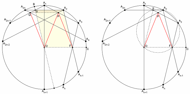 Пусть C – середина дуги A3An–1. Прямые A2A2n и OC параллельны как перпендикуляры к диаметру A1An+1. Диагонали A3An и An–1A2 симметричны относительно прямой OC, поэтому точка F лежит на ней. Далее можно рассуждать по-разному. Первый способ. Пусть B – середина дуги A1A2n (рис. слева). Диагонали A1A2n–1 и A2nA2 симметричны относительно прямой OB, поэтому пересекаются на ней в точке S. Прямые OB и A2An–1 параллельны ввиду равенства дуг, заключённых между ними. Следовательно, FOSA2 – параллелограмм.
