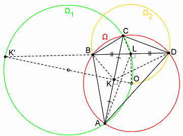 Пусть K и L – середины AC и BD соответственно. Отрезки OK и OL перпендикулярны соответственно хордам AC и BD окружности Ω. Пусть K' – точка, диаметрально противоположная точке O на Ω1. Поскольку L лежит на Ω1, то угол OLK' прямой. Значит, прямая BD проходит через K'. Далее можно рассуждать по-разному. Первый способ. Можно считать, что углы A и D острые (см. рис.). Углы ALB и BLC равны как опирающиеся на равные дуги AK' и CK' окружности Ω1. Поэтому ∠BLC = ½ ∠ALC = ½ ∠AOC = ∠ADC. Значит, треугольники ACD и BCL подобны по двум углам. Отсюда AC : AD = BC : BL, то есть