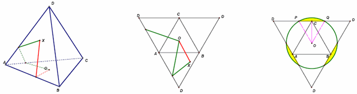а) Рассмотрим развёртку в виде правильного треугольника и докажем, что кратчайший путь из его центра в любую точку будет на этой развертке отрезком. Пусть O – центр грани ABC, X – точка на грани ABD и некоторый путь из O в X пересекает сначала ребро AC (рис. слева). Если продолжить этот путь на развёртке, мы попадём в некоторую точку на ребре AD. Но в эту точку ведёт и путь через ребро AB, через которое в X можно попасть напрямую (рис. в центре).