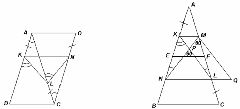 Через точку М проведём прямую, параллельную KL, до пересечения с прямой NL в точке Q. Тогда в треугольнике MNQ MN = MQ и ∠QMN = 60°, значит, этот треугольник равносторонний. Следовательно, MQ = NQ, поэтому KL = NL + LQ = NL + KM.