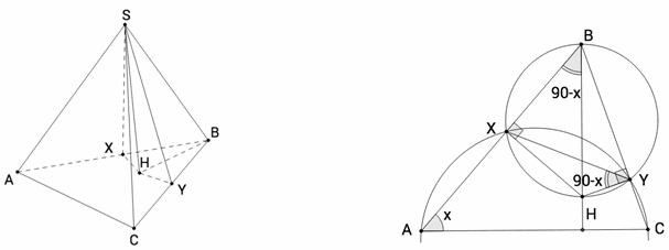 Решение 1: Пусть H – проекция точки S на плоскость ABC, тогда по теореме о трёх перпендикулярах HX ⊥ AB и HY ⊥ BC (рис. слева).