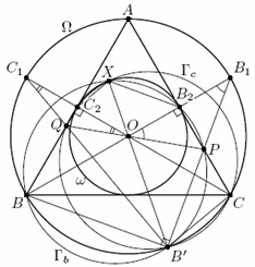Пусть B2 и C2 – точки касания ω с AC и AB соответственно, а B1 и C1 – точки, диаметрально противоположные точкам B и C (см. рис.). Тогда точки B1 и C1 симметричны O относительно сторон AC и AB соответственно, откуда ∠OB1P = ∠B1OP, ∠OC1Q = ∠C1OQ,