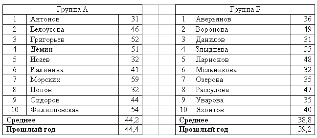 В классе у Марии Ивановны прошёл ежегодный тест по английскому языку. Оказалось, что в обеих группах А и Б средний балл понизился по сравнению с прошлым годом (см. таблицу).