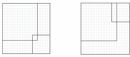 В первом случае пересечением ковров является квадрат площади 4 м² (рис. слева), значит, длина стороны этого квадрата равна 2 м. Во втором случае, пересечение – прямоугольник, одна сторона которого также равна 2 м (рис. справа). Следовательно, другая сторона этого прямоугольника равна