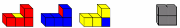 На первом цветном фото – 8 красных граней, на втором – 8 синих, на третьем – 8 жёлтых. Так как у четырёх кубиков в совокупности 6·4 = 24 грани и 8·3 = 24, то на первом фото есть все красные грани, на втором – все синие, на третьем – все жёлтые.