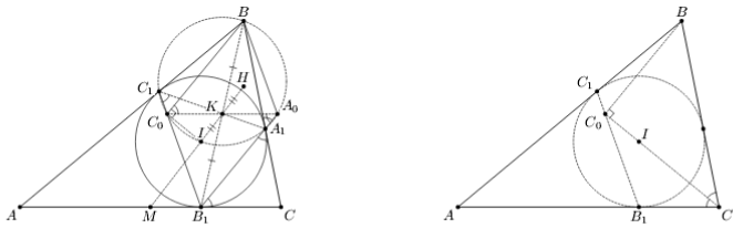 Рассмотрим описанную окружность треугольника A0BC0. Заметим, что точка I диаметрально противоположна точке B (поскольку ∠BC1I = 90°). Согласно решению задачи 208600 точки H и I симметричны относительно середины K отрезка A0C0, то есть достаточно доказать, что точки M, I и K лежат на одной прямой (рис. слева). Далее можно рассуждать по-разному. Первый способ. Пусть T – точка касания вневписанной окружности треугольника ABC со стороной AC. Как известно, точка M – середина отрезка TB1, а прямая BT проходит через точку вписанной окружности, диаметрально противоположную точке B1. Следовательно, прямая MI содержит среднюю линию треугольника BB1T, а значит, делит BB1 пополам.