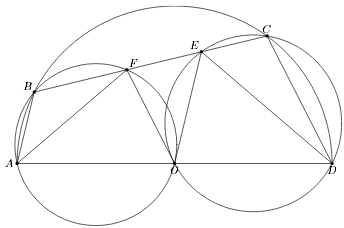 На окружности радиуса R с диаметром AD и центром O выбраны точки B и С по одну сторону от этого диаметра. Около треугольников ABO и CDO описаны окружности, пересекающие отрезок BC в точках F и E. Докажите, что AF·DE = R².