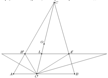 Пусть L – точка пересечения отрезков CC' и A'B'. Тогда BC' : AC' = A'L : B'L = A'C' : B'C' и из равенства A'C' + B'C' = AB получаем, что BC' = C'A', AC' = C'B'. Поэтому точки CA и CB, симметричные C' относительно AC и BC лежат на прямой A'B', а AC'B'CA – ромб.