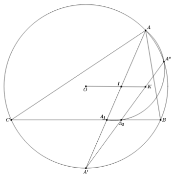 Пусть A' – середина дуги BC. Так как OA' || IA2, прямые OI и A'A2 пересекаются в точке K – центре гомотетии описанной и вписанной окружностей (см. рис.). Докажем, что K – искомый радикальный центр. Первый способ. Так как инверсия с центром A' и радиусом A'B меняет местами прямую BC и описанную окружность Ω треугольника ABC, точка A1 переходит в A, а A2 – в точку A'' пересечения прямой A'A2 с описанной окружностью. Следовательно, точки A, A1, A2 и A'' лежат на одной окружности.