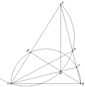 ∠AHC′ = ∠C > ∠A = ∠CHB′ и ∠AHB′ > ∠BHC′, крайние точки этого отрезка соответствуют совпадению точки P с B или Q с C. Рассмотрим для определенности последний случай (см. рис.).