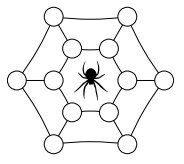 Паук сплёл паутину, и во все её 12 узелков попалось по мухе или комару. При этом каждое насекомое оказалось соединено отрезком паутины ровно с двумя комарами. Нарисуйте пример, как это могло быть (написав внутри узелков буквы М и К).