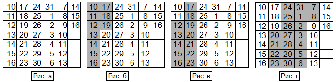 Составим календарь с 10 июля до 16 августа, условно считая 10 августа первым днем недели. Каждая строка календаря соответствует одному и тому же дню недели (см. рис. а). Пусть в первый день недели обед стоит а1 сольдо, во второй – а2 сольдо, ..., в седьмой день – а7 сольдо. Стоимость всех обедов за неделю обозначим P = а1 + а2 + ... + а7. Отметим на нашем календаре дни, в которые обедали Аня (см. рис. б), Ваня (см. рис. в) и Таня (см. рис. г).