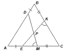 Рассмотрим треугольники ADM и CЕK (см. рисунок): DA = AB – AE = AC – AE = CE; AM = AC – CM = AB – CM = KC; ∠ DAM = 60° = ∠ EСK. Следовательно, эти треугольники равны (по двум сторонам и углу между ними). Тогда ∠ AMD = ∠ CKE.