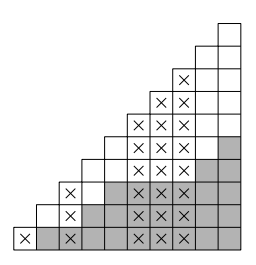 Теперь посчитаем количество крестиков в незакрашенных клетках. Пусть n-й день был пасмурным и до этого было k солнечных дней. Тогда в соответствующем столбце будет стоять n – k "незакрашенных" крестиков (и k "закрашенных"). Заметим, что это ровно (n – k)-й пасмурный день, то есть в первый пасмурный день незакрашенный крестик будет один, во второй – два и т. д. Таким образом, количество незакрашенных крестиков равно 1 + 2 +3 + ... + 15.
