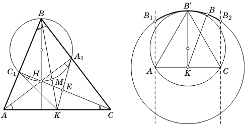 Точка $B$ лежит на дуге $B_1B_2$ большей окружности, так как треугольник $ABC$ остроугольный. При этом угол $B$ меняется в достаточно малом диапазоне: от $\arctan\sqrt2$, не включая (это наименьшее значение соответствует точкам $B_1$ и $B_2$ и прямоугольному треугольнику $ABC$ с катетами $b$ и $b/\sqrt2$), до $60^\circ$ (это наибольшее значение угла $B$, поскольку две окружности на рисунке справа касаются внутренним образом, и поэтому $\angle ABC < \angle AB'C$ при $B\neq B'$). В силу непрерывности угла $ABC$ при движении точки $B$ по дуге $B'B_2$ любое промежуточное значение из интервала $(\arctan\sqrt2;60^\circ)$ соответствует некоторому положению $B''$ точки $B$. Для построенного треугольника $AB''C$ точка $M$ будет лежать на окружности, описанной около треугольника $A_1BC_1$, так как будет выполнено соотношение $KC_1^2=KM\cdot KB$. Комментарий. Соотношение $(b/2)^2=m^2/3$ можно получить и другим способом. Если $D$ — точка, симметричная $B$ относительно точки $K$, то $ABCD$ — параллелограмм, поэтому $\angle DAH=\angle DCH=90^\circ$, и, кроме того, $\angle DMH=180^\circ-\angle BMH=90^\circ$. Поэтому точки $A$, $C$ и $M$ лежат на окружности, построенной на $DH$ как на диаметре. Следовательно, $AK\cdot KC=MK\cdot KD$, откуда и следует требуемое соотношение.