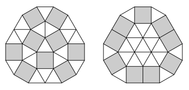 Поэтому во внутренней вершине могут сходиться либо 6 треугольников, либо 3 треугольника и 2 квадрата, либо 4 квадрата