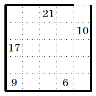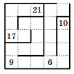 На клетчатой бумаге был нарисован лабиринт: квадрат 5×5 (внешняя стена) с выходом шириной в одну клетку, а также внутренние стенки, идущие по линиям сетки. На рисунке мы скрыли от вас все внутренние стенки. Начертите, как они могли располагаться, зная, что числа, стоящие в клетках, показывают наименьшее количество шагов, за которое можно было покинуть лабиринт, стартовав из этой клетки (шаг делается в соседнюю по стороне клетку, если они не разделены стенкой). Достаточно одного примера, пояснения не нужны.