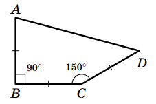 Три стороны четырёхугольника равны, а углы четырёхугольника, образованные этими сторонами, равны 90° и 150°. Найдите два других угла этого четырёхугольника.
