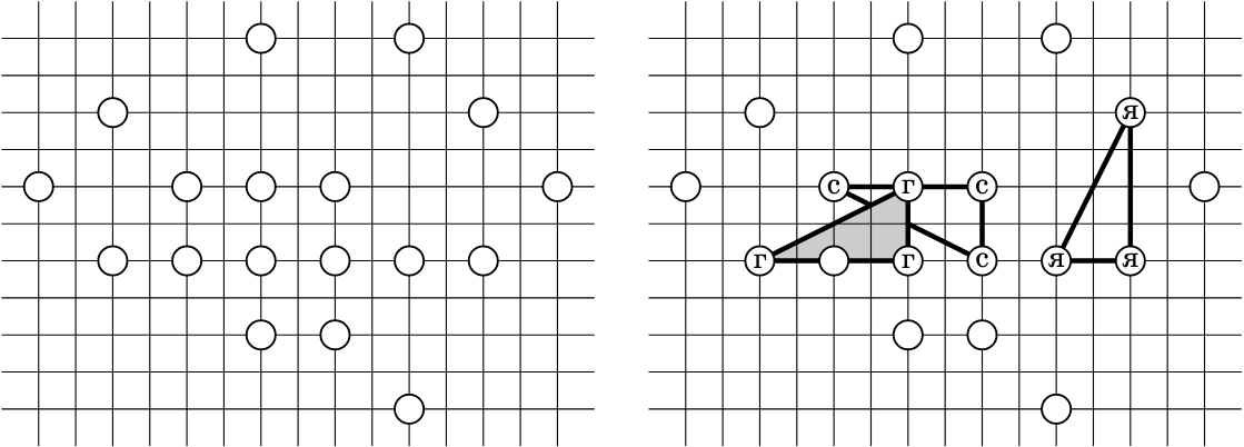 Царь пообещал награду тому, кто сможет на каменистом пустыре посадить красивый фруктовый сад. Об этом узнали два брата. Старший смог выкопать 18 ям (см. рис. слева). Больше нигде не удалось, только все лопаты сломал. Царь рассердился и посадил его в темницу. Тогда младший брат Иван предложил разместить яблони, груши и сливы в вершинах равных треугольников (см. рис. справа), а остальные ямы засыпать.