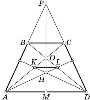 Первое решение(основано на работе участника олимпиады А. Маланьина). По замечательному свойству трапеции точка пересечения продолжений боковых сторон $P$, точка пересечения диагоналей $O$ и середина основания $AD$ точка $M$ лежат на одной прямой. Пусть $K$, $L$ — середины диагоналей $AC$ и $BD$. Тогда $KL \parallel AD$, т.е. $AKLD$ — тоже трапеция, и по её замечательному свойству точка $O$, точка пересечения её диагоналей $H$ и точка $M$ лежат на одной прямой. Следовательно, точки $P$, $H$ и $M$ лежат на одной прямой.