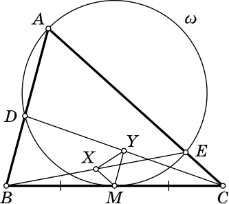 Точка $M$ – середина стороны $BC$ треугольника $ABC$. Окружность $\omega$ проходит через точку $A$, касается прямой $BC$ в точке $M$ и пересекает сторону $AB$ в точке $D$, а сторону $AC$ – в точке $E$. Пусть $X$ и $Y$ – середины отрезков $BE$ и $CD$ соответственно. Докажите, что окружность, описанная около треугольника $MXY$, касается $\omega$.