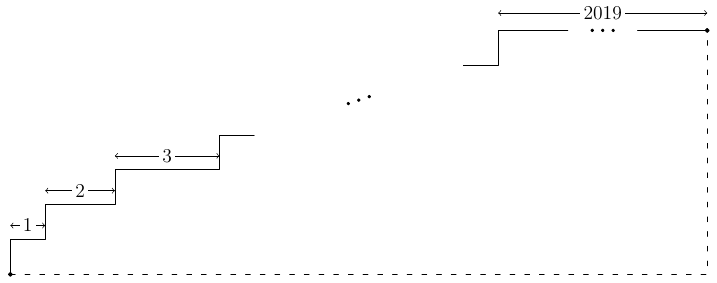 Высота каждой из 2019 ступенек «лестницы» (см. рисунок) равна 1, а ширина увеличивается от 1 до 2019. Правда ли, что отрезок, соединяющий левую нижнюю и правую верхнюю точки этой лестницы, не пересекает лестницу?