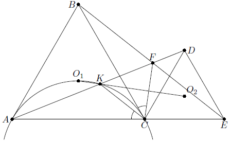 Прежде всего, заметим, что треугольники $ACD$ и $BCE$ равны, поскольку $AC=BC$, $CD=CE$ и $\angle ACD=\angle BCE=120^{\circ}$. Кроме того, так как $\angle BFC=120^{\circ}$ и $\angle CFE=60^{\circ}$, точка $F$ лежит на отрезке $BE$. Наконец, треугольник $O_1CO_2$ подобен треугольнику $ACD$, следовательно, $\angle CO_1K=\angle CAK$, т.е. точки $A$, $O_1$, $K$ и $C$ лежат на одной окружности (см. рис.). Поэтому