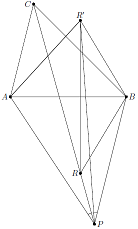Поскольку прямые $BR$ и $BP$ симметричны относительно биссектрисы угла $B$, точки $P$ и $R$ изогонально сопряжены относительно треугольника $ABC$. Поэтому $\angle R'AB = \angle RAB = \pi - \angle CAP$, т.е прямые $AR'$ и $AC$ симметричны относительно биссектрисы угла $A$. Аналогично прямые $BR'$ и $BC$ симметричны относительно биссектрисы угла $B$. Следовательно, точки $R'$ и $C$ изогонально сопряжены относительно треугольника $ABP$, откуда и получаем утверждение задачи.
