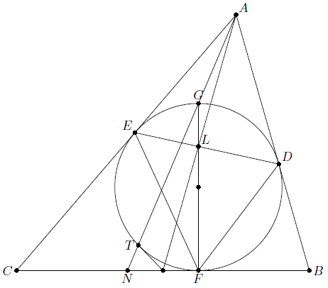 Пусть $G$ – точка вписанной окружности, противоположная $F$. Так как вписанная и вневписанная окружности гомотетичны с центром $A$, точки $A$, $G$ и $N$ лежат на одной прямой, а $FT\perp AN$. При полярном преобразовании относительно вписанной окружности прямая $ED$ переходит в $A$, $FT$ – в точку пересечения касательных к окружности в точках $F$ и $T$, т.е. середину $FN$, совпадающую с серединой $BC$, а прямая, проходящая через $A$ и параллельная $BC$, – в точку $L$ пересечения $ED$ и $GF$. Таким образом, достаточно доказать, что $AL$ – медиана треугольника $ABC$.