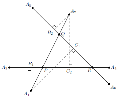 Это значит, что $A_1P=QA_2$. Отсюда следует, что $\triangle A_1PB_1 = \triangle A_2QB_2$, то есть $\angle P=\angle Q$. Аналогичным рассуждением получаем, что $\triangle PQR$ равносторонний, а тогда $A_1P = QA_2 = A_3P = RA_4 = A_6R = QA_5$. Легко проверить, что эта конструкция удовлетворяет условиям.