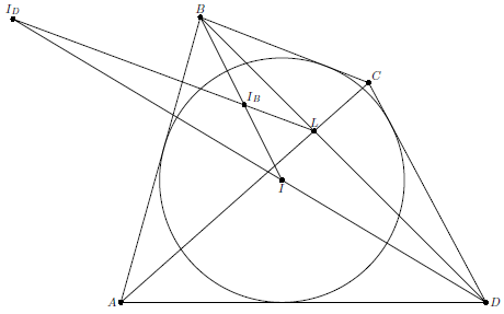 Решение 1:Пусть $L$ – точка пересечения диагоналей четырехугольника, $I$ – центр его вписанной окружности, $I_B$ – центр вписанной окружности треугольника $ABC$, $I_D$ – центр вневписанной окружности треугольника $ADC$. Очевидно, что $I_B$ лежит на отрезке $BI$, причем отношение $BI_B:BI$ равно отношению $r_B:r$ радиусов окружностей, вписанных в треугольник $ABC$ и четырехугольник $ABCD$ соответственно. С учетом равенств $S_{ABCD}=(AB+BC+CD+DA)r/2$, $S_{ABC}=(AB+BC+CA)r_B/2$ и $S_{ABC}:S_{ABCD}=BL:BD$ получаем, что
