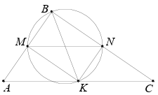 Пусть точка $M$ лежит на $AB$, точка $N$ – на $BC$, а точка $K$ – середина $AC$. Тогда $BK = 0,5AC$ (в прямоугольном треугольнике медиана равна половине гипотенузы). Так как угол $B$ прямой, то $MN$ – диаметр данной окружности. Поскольку $BK = 0,5AC = MN$, то $BK$ – тоже диаметр. Следовательно, $KM \perp AB$, то есть $KM$ – средняя линия треугольника $ABC$. Аналогично $KN$ – средняя линия.